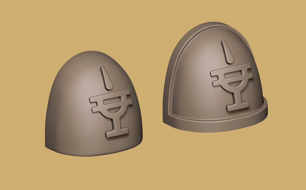 These are armored Rogue Trader style Pauldrons for use with various power armored models for tabletop wargames.