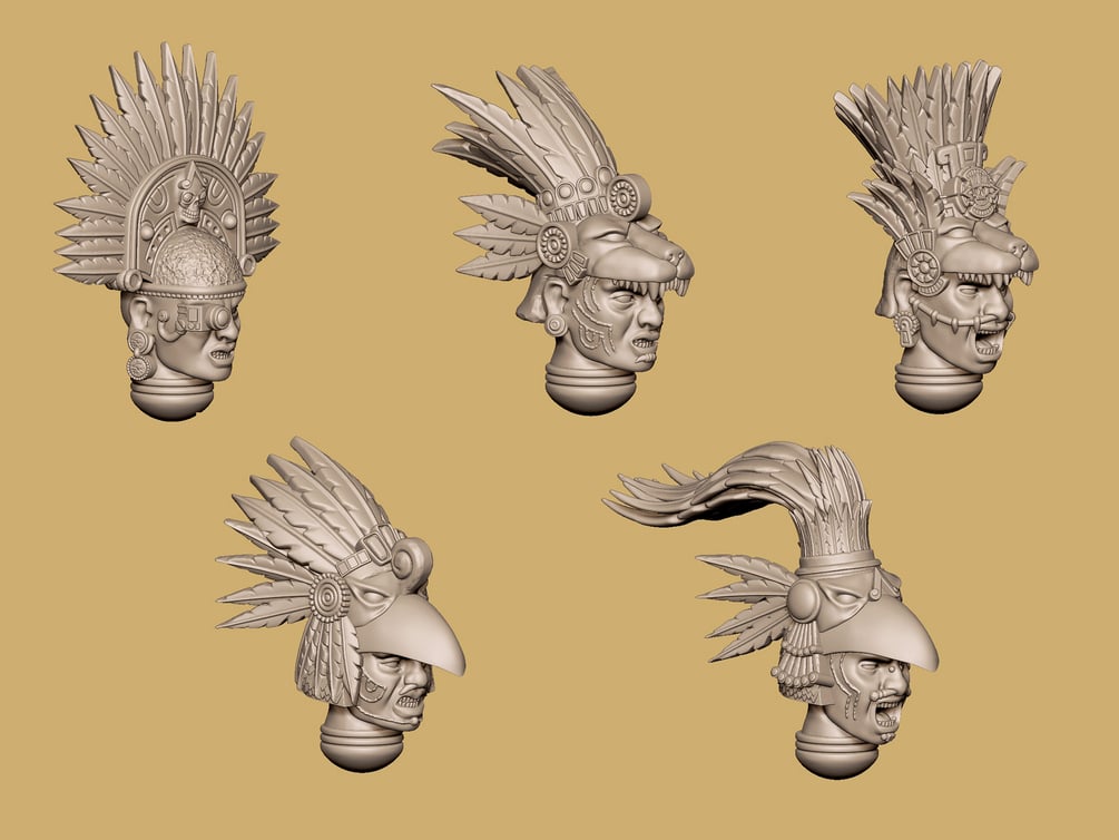 These are a set of 21 Meso-American themed heads for use with various power armored models for tabletop wargames.