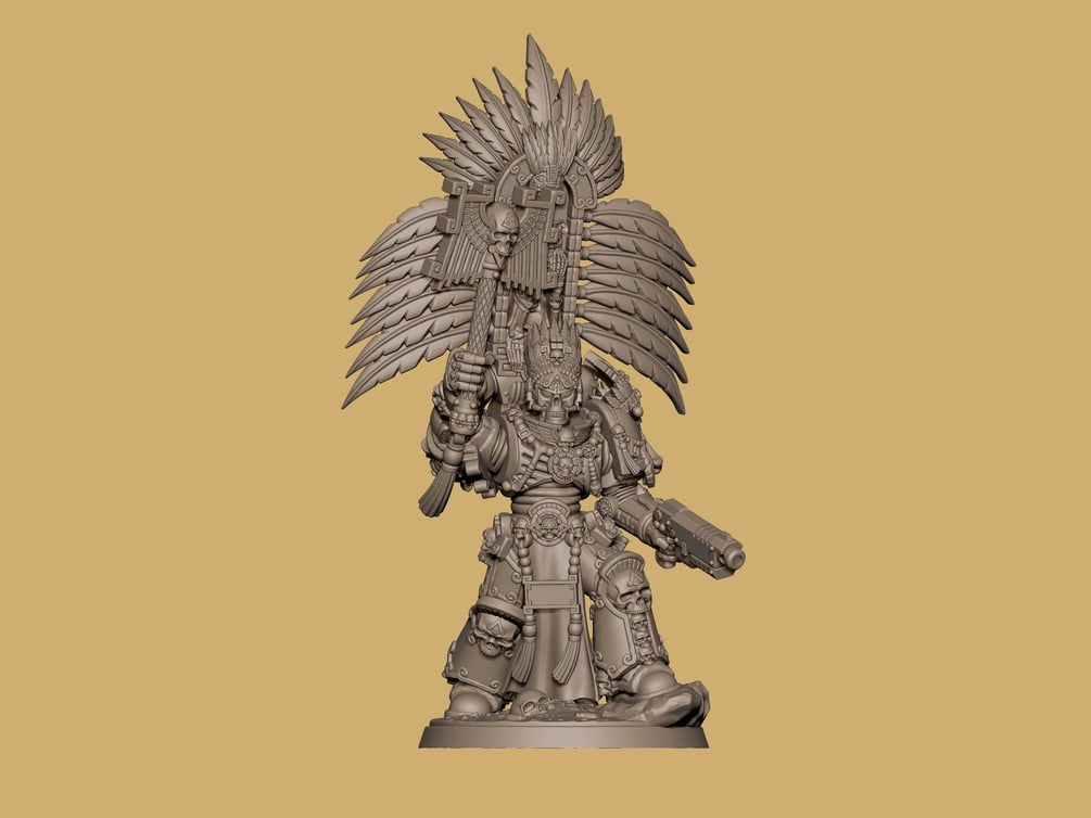This is a Mesoamerican themed Warpriest in powered armor for use with various tabletop wargames.